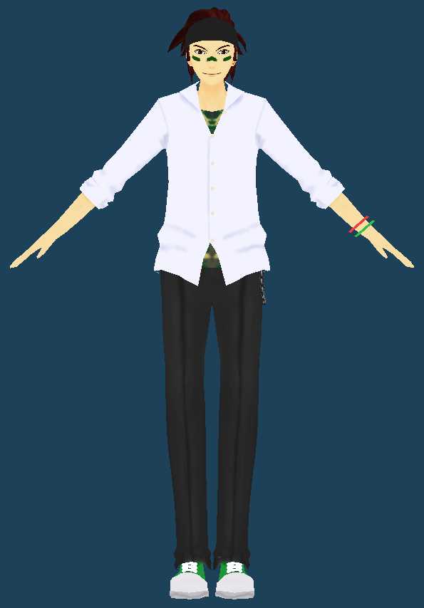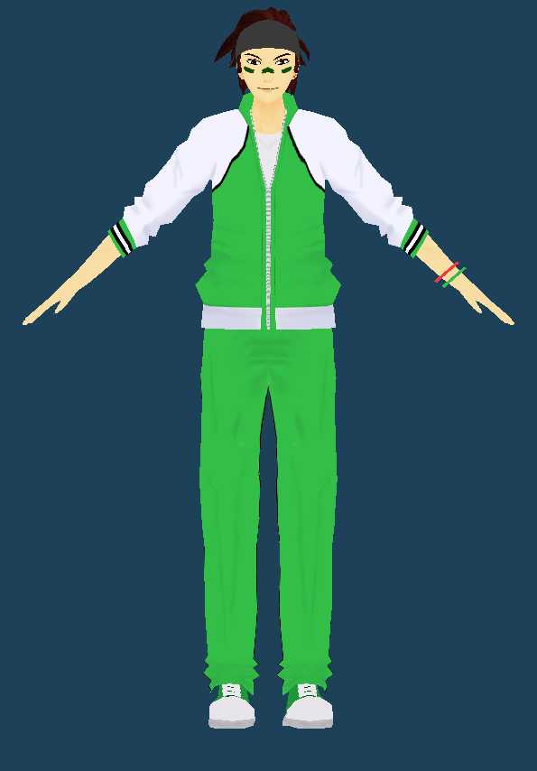 んー、やっぱり肩らへんのウエイトがおかしいから裂けるな・・・。 どうしたもんなのか・・・ あとジャージの上着の黒いライン、テクスチャが伸びて変。 |